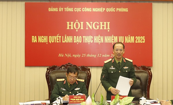 CNQP&KT - Sáng 25/12, Đảng ủy Tổng cục Công nghiệp quốc phòng (CNQP) đã tổ chức Hội nghị ra Nghị quyết lãnh đạo thực hiện nhiệm vụ năm 2025. Đồng chí Thượng tướng Phạm Hoài Nam, Ủy viên Trung ương Đảng, Ủy viên Quân ủy Trung ương, Thứ trưởng Bộ Quốc phòng, dự và chỉ đạo hội nghị. Đồng chí Thiếu tướng Đinh Quốc Hùng, Bí thư Đảng ủy, Chính ủy Tổng cục CNQP, chủ trì hội nghị.