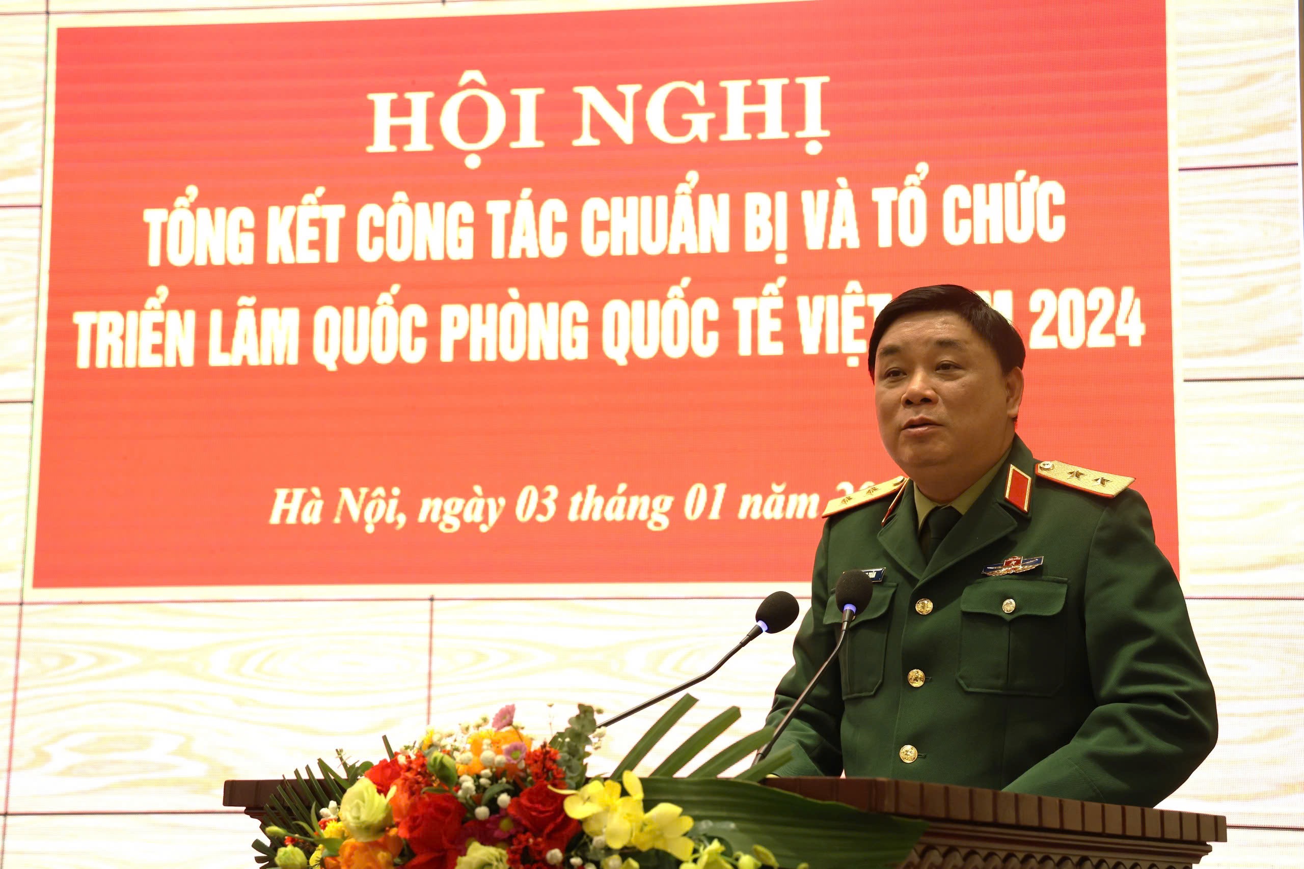 Phát biểu chỉ đạo hội nghị, Trung tướng Hồ Quang Tuấn biểu dương những kết quả mà các cơ quan, đơn vị trong Tổng cục CNQP đã đạt được trong tổ chức Triển lãm. Để phát huy kết quả từ Triển lãm Quốc phòng Quốc tế Việt Nam 2024 và nâng cao hiệu quả hợp tác quốc phòng trong những năm tới, đồng chí Chủ nhiệm Tổng cục yêu cầu các cơ quan, đơn vị tiếp tục xây dựng và hoàn thiện các văn bản pháp lý liên quan đến CNQP, an ninh và xuất khẩu sản phẩm quốc phòng, đặc biệt là các quy định về xuất khẩu, chuyển giao công nghệ. Tập trung nghiên cứu và hoàn thiện các nghị định, quyết định của Nhà nước nhằm đơn giản hóa thủ tục và tạo điều kiện thuận lợi hơn cho xuất khẩu sản phẩm quốc phòng, thúc đẩy hợp tác quốc tế trong lĩnh vực này. Tối ưu hóa công suất các dây chuyền sản xuất hiện có và đầu tư các dây chuyền mới để đáp ứng nhu cầu trong và ngoài nước. Tiếp tục nghiên cứu đảm bảo việc trưng bày các sản phẩm tại Triển lãm có tính năng, kiểu dáng phù hợp với yêu cầu quốc tế, từ đó mở rộng thị trường xuất khẩu và nâng cao năng lực cạnh tranh của sản phẩm quốc phòng Việt Nam. Bên cạnh đó, các cơ quan, đơn vị cần tập trung nghiên cứu, tổng hợp thông tin về các sản phẩm công nghệ và vũ khí được trưng bày tại Triển lãm để đề xuất hướng ưu tiên phát triển trong thời gian tới. Đồng thời, nghiên cứu chuẩn bị Đề án tổ chức Triển lãm Quốc phòng Quốc tế Việt Nam 2026, với mục tiêu tổ chức định kỳ 2 năm/lần, tăng cường sự tham gia của các đối tác quốc tế và nâng cao quy mô sự kiện, từ đó thúc đẩy Việt Nam trở thành một đối tác quan trọng trong ngành quốc phòng toàn cầu.